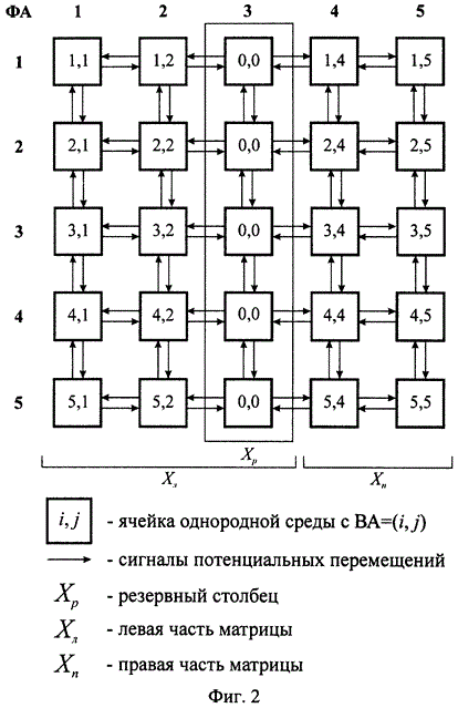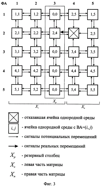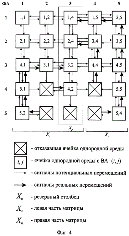 При возникновении отказов ПЭ множество взаимодействующих ячеек однородной среды процессорных элементов перенастраивает работоспособные ПЭ (в том числе и резервные) на новые ВА. Взаимодействие ячеек однородной среды процессорных элементов осуществляется сигналами потенциальных и реальных перемещений, поступающих от (i,k)-й ячейки однородной среды процессорных элементов в (i+1,j)-ю, (i-1,j)-ю, (i,j+1)-ю и (i,j-1)-ю. Сигналы потенциальных перемещений от (i,j)-й ячейки однородной среды процессорных элементов информируют соседние ячейки о возможности перенастройки (i,j)-го ПЭ на один из соответствующих алгоритмов функционирования. Сигнал реального перемещения от (i, j)-й ячейки информирует одну из соседних ячеек о ее перенастройке на (i, j)-й алгоритм.