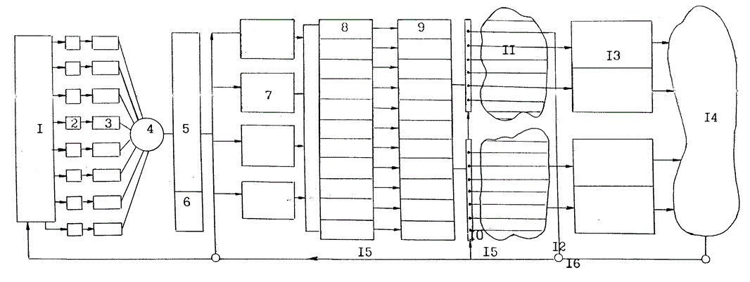 На чертеже показана схема замкнутой системы очистки свинокомплекса на 24 тыс. голов в рыбоводно-биологических прудах, где 1 - свинокомплекс, 2 - навозосборники, 3 - отстойники-накопители, 4 - насосная станция, 5 - площадка компостирования, 6 - площадка промывки щебня, 7 - пруды-накопители осветленных стоков, 8 - секционные водорослевые пруды, 9 - секционные рачковые пруды, 10 - распределительное устройство, 11 - ботаническая площадка с высшей водной растительностью, 12 - борозды с перемычками, 13 - рыбоводные пруды, 14 - пруд чистой воды, 15 - напорный трубопровод, 16 - задвижка.