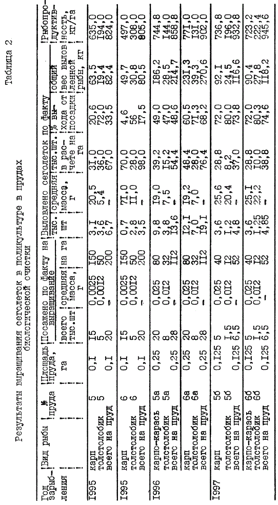 Согласно разработанной технологии предлагается следующая плотность посадки трехдневных личинок: карпа 30 - 40 тыс. шт/га или карпо-карася не более 30 тыс. шт/га и растительноядных 10 тыс. шт/га. Личинок карпа и растительноядных рыб сажают в пруд одновременно. Выход продукции сеголеток массой 20 - 25 г составляет 60 - 70% от посадки. Рыбопродуктивность 8 - 10 ц/га. Результаты выращивания сеголеток приведены в табл. 2.