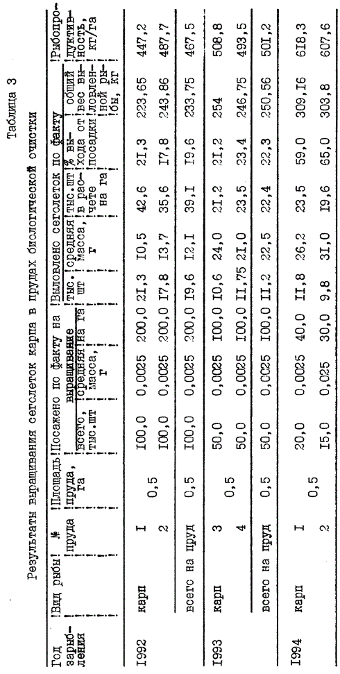 Пример 2. Сточные воды отстаиваются, проходят механическую очистку, затем последовательно все ступени биологической очистки: пруды-накопители, водорослевые, рачковые пруды, ботаническую площадку и рыбоводные пруды. В последней ступени очистки - рыбоводных прудах производят подращивание трехдневной личинки карпа в монокультуре. Подращивание карпа осуществляют при различной плотности посадки (табл. 3): 30 - 40 тыс.шт/га, 100 и 200 тыс. шт/га. Лучшие рыбоводные показатели получают при плотности посадки 30 - 40 тыс. шт/га, рыбопродуктивность 6 ц/га. Санитарно-гидрохимические и бактериологические показатели очищенных стоков уступают показателям, полученным в примере 1, ХПК - 30 - 40 мг O2/л, коли-титр 10 млн.мк.кл/л.