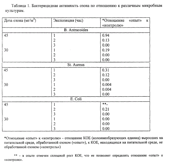 Бактерицидная активность озона по отношению к спорообразующим палочкам (B. Antracoides), грамположительным коккам (St. Aureus) и грамотрицательным палочкам (E. Coli) оптимальна при 3-х часовой экспозиции и концентрации озона - 30 мг/м3. Более высокая концентрация - 40-45 мг/м3 и менее продолжительная обработка объектов, содержащих эти микроорганизмы (1-2 ч) обеспечивают худший бактерицидный эффект озоновоздушной смеси (см. табл. 1).