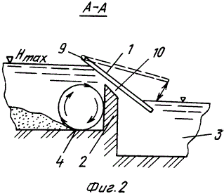 Наиболее близким к предлагаемому изобретению по технической сущности будет устройство, реализующее способ регулирования гидравлической структуры потока воды, содержащее циркуляционный порог водозаборного сооружения, а также стенку, расположенную перед порогом и прикрепленную верхней кромкой к оси, установленной над порогом (Патент Российской Федерации N 2005846 C1, МКИ E 02 B 8/02, Б.И. N 1, 1994 г.).